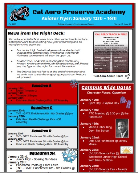 Here is our Aviator Parent flyer with important information and upcoming events for the week ahead. We hope to see you at our PTO meeting coming up on Tuesday, January 13, 2026 at 6:30pm at the Parkhouse next door to the school.