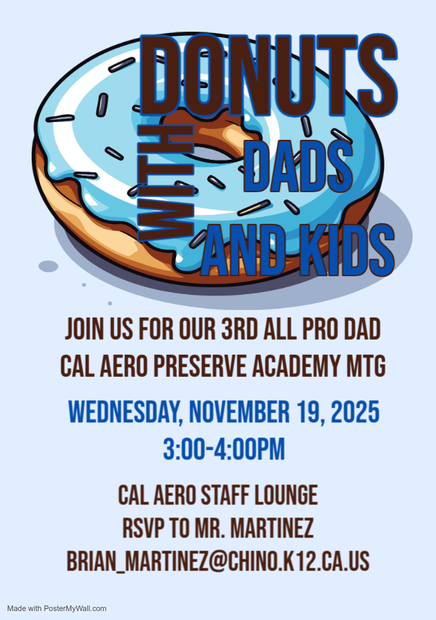 We will be having our 3rd All Pro Dad and Kids with Donuts meeting tomorrow, Wednesday, November 19th from 3:00pm to 4:00pm in our Cal Aero Staff Lounge.